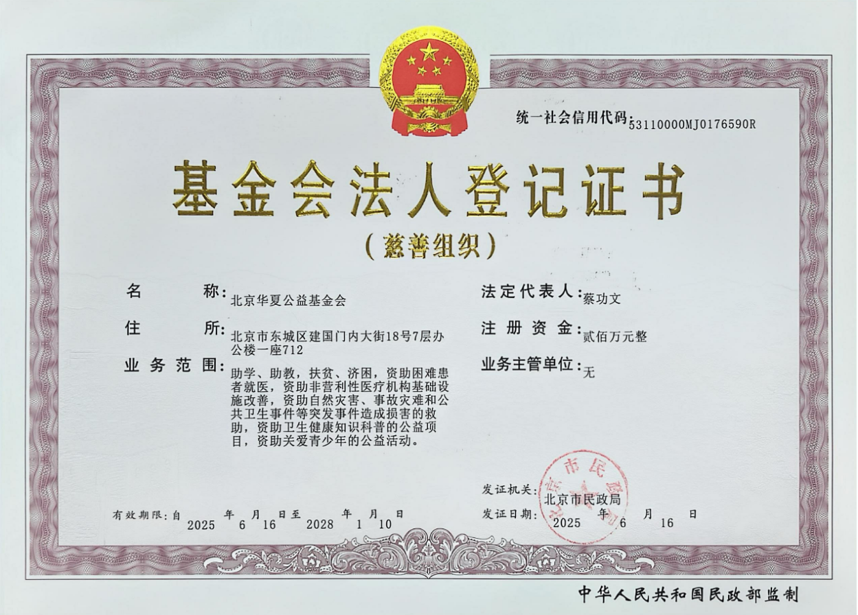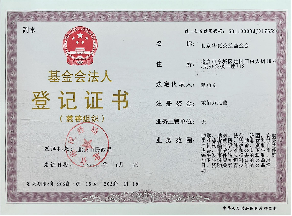 北京华夏公益基金会(简称“华夏基金会”,英文名Huahsia Foundation,缩写HSF)成立于2016年8月18日,以开展慈善活动为宗旨,不以盈利为目的;弘扬中华优秀传统文化,促进国际人文交流合作。是中关村智慧医工交叉协会会长单位、中国西部开发促进会副会长单位、全国中小城市委员会副会长单位。