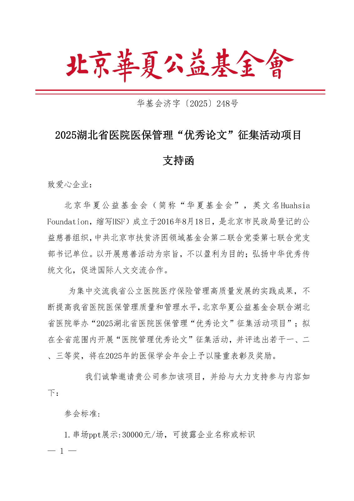 2025湖北省医院医保管理“优秀论文”征集活动项目-支持函