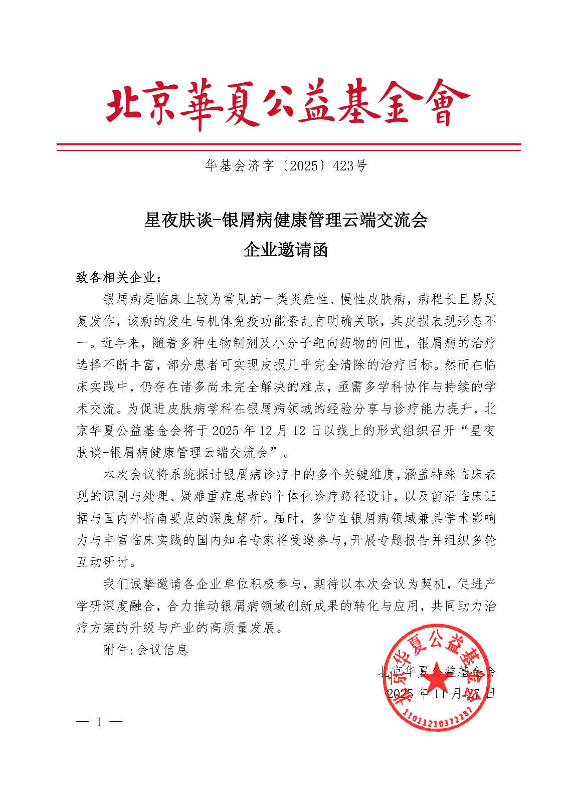 星夜肤谈-银屑病健康管理云端交流会-企业邀请函