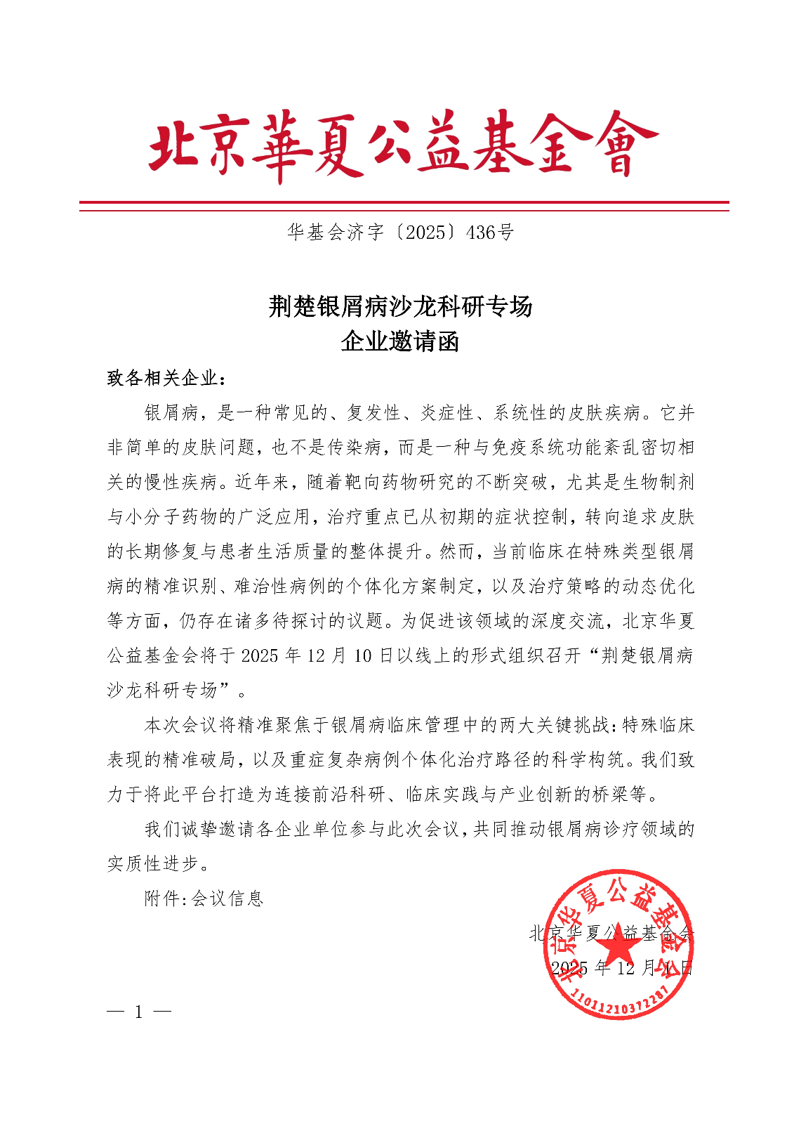 荆楚银屑病沙龙科研专场-企业邀请函