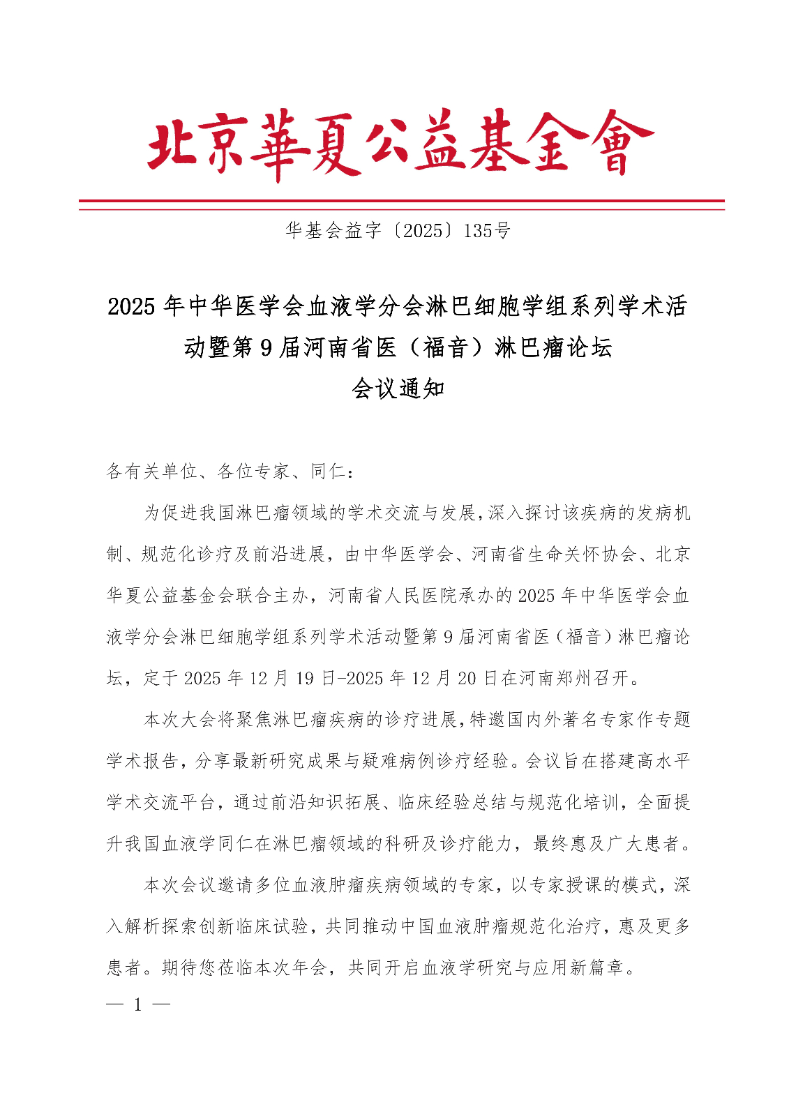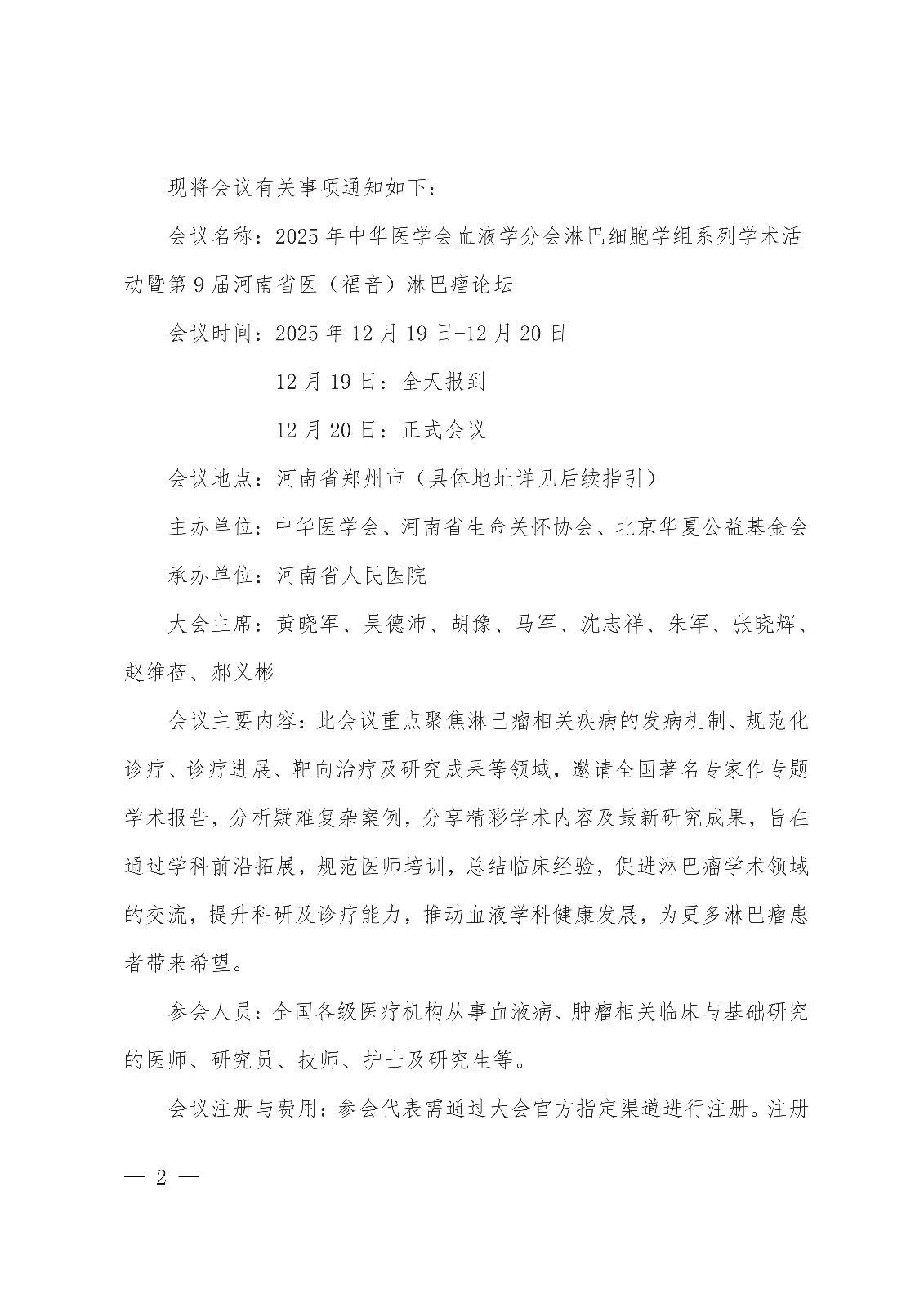 2025年中华医学会血液学分会淋巴细胞学组系列学术活动暨第9届河南省医(福音)淋巴瘤论坛-会议通知