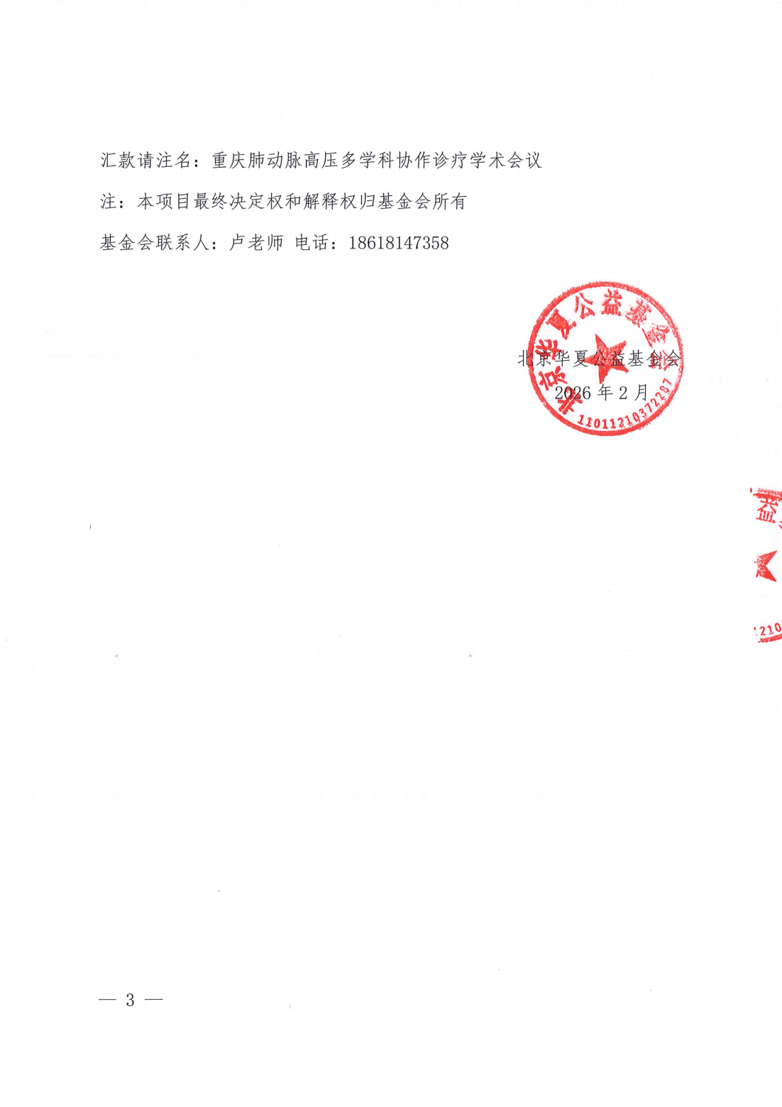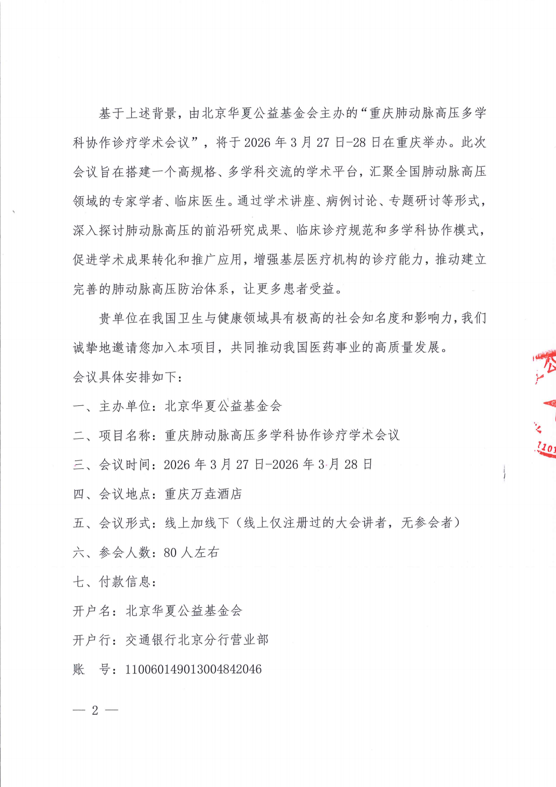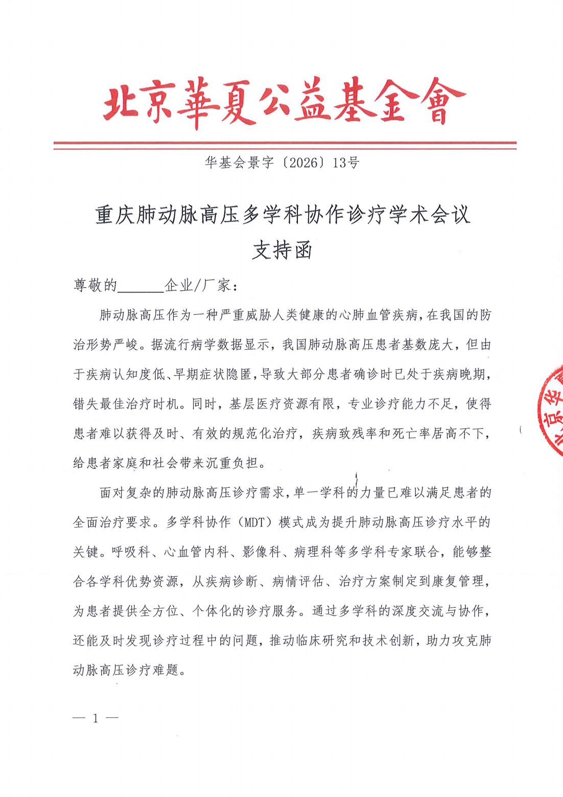 重庆肺动脉高压多学科协作诊疗学术会议-支持函