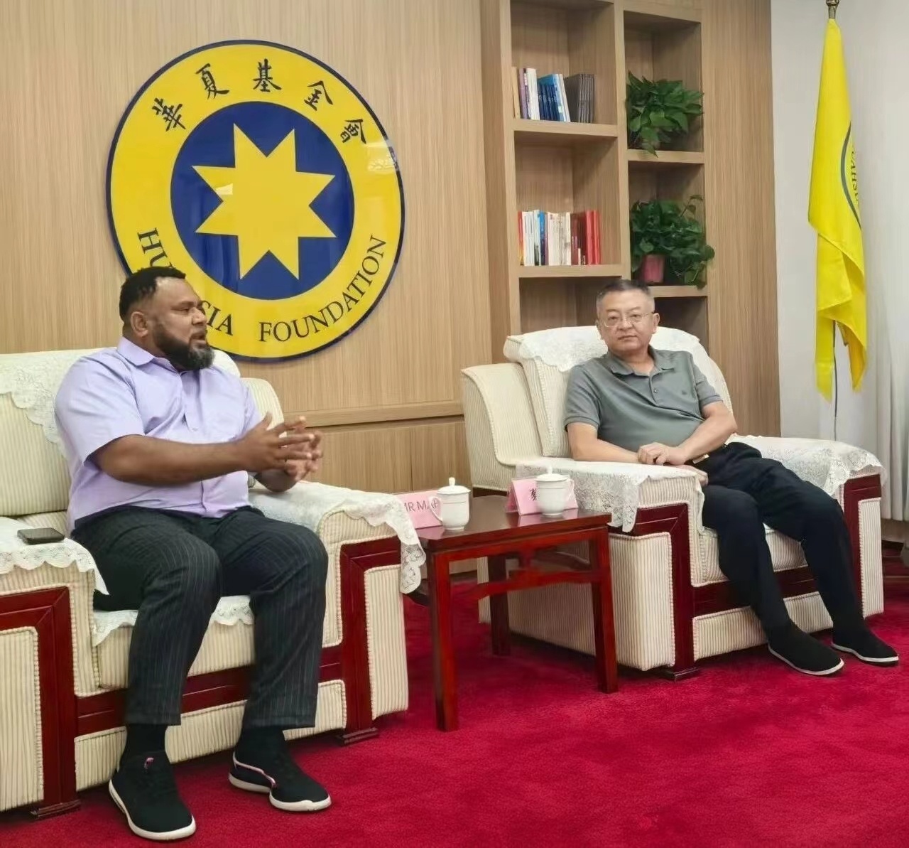 马赫部长对蔡功文理事长的热情接待表示感谢,对华夏基金会在公益和国际交流领域取得的成就给予高度评价。他表示,瓦努阿图高度重视土地可持续利用与文化传承保护,华夏基金会在传统文化推广与国际合作方面的经验值得借鉴。并详细介绍了瓦努阿图的土地和招商政策,希望中国的企业家和投资者到瓦努阿图投资兴业。马赫部长认为,双方在土地矿产、文化交流、生态保护、社区公益项目等领域具有广阔的合作空间,期待未来能推动具体合作项目落地,进一步促进两国人民之间的友好交流与相互理解。