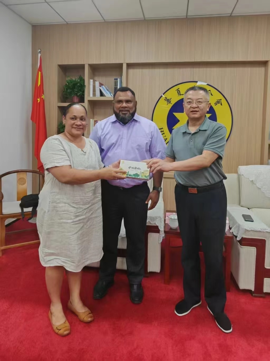 蔡功文理事长对马赫部长一行的到访表示欢迎,并详细介绍了基金会自2016年成立以来的发展历程、核心业务及重点项目成果。他特别回顾了今年3月访问瓦努阿图时的见闻,对瓦努阿图美丽的自然风光、独特的文化传统以及热情友好的人民表示赞赏。蔡功文表示,华夏基金会始终致力于推动中华优秀传统文化的国际传播,并在医药健康、国际人文交流等领域开展多项公益项目,希望未来能与瓦努阿图在自然资源开发,以及医疗、文化、能源、公益等多方面建立更深层次的合作。